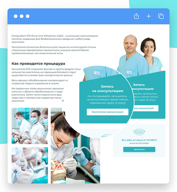 Мы создали отдельные страницы для всех услуг, которым это необходимо. У нас есть отдельные посадочные для металлокерамических и циркониевых корон, кариеса и пульпита. Это позволяет готовому сайту стоматологий привлекать больше посетителей.