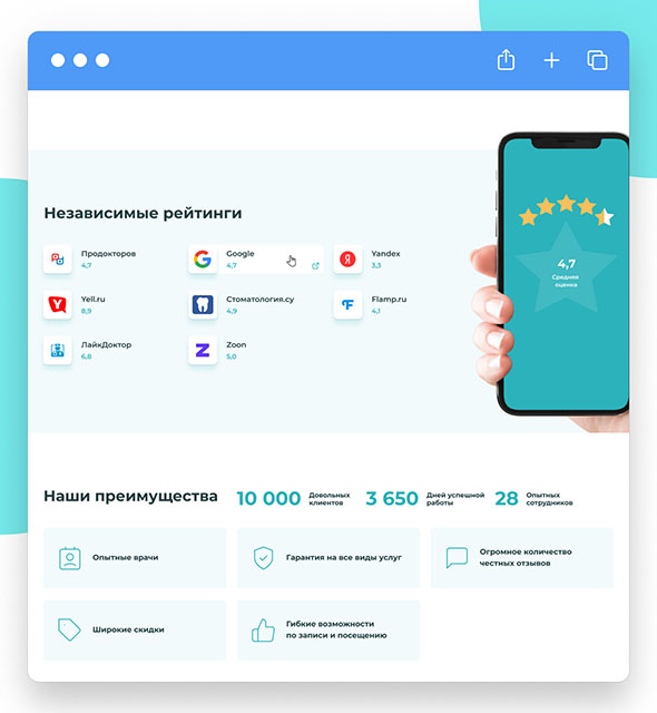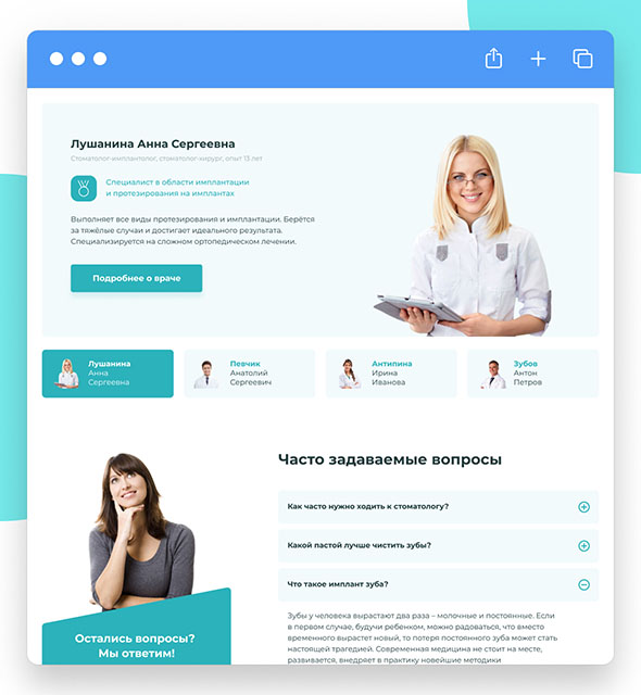 Наш сайт стоматологии создан с учетом того, что важно для пациентов: отзывов, примеров работ, документов. Вы сможете рассказать максимум о своих врачах: образование, сертификаты, подтверждение квалификации, опыт работы и многое другое.