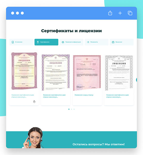 Раз в год проводим редизайн готового решения. В результате сайт вашей клиники остается современным. Обновление дизайна дорогой процесс, который стоит сотни тысяч рублей. Вам он достается без дополнительных затрат.