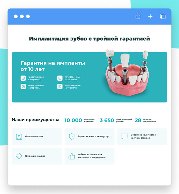 Предусмотрели все моменты, которые нужны для вывода сайта в ТОП-10 Яндекса и Google по важным, высокочековым запросам: стоматология, протезирование, имплантация, виниры.